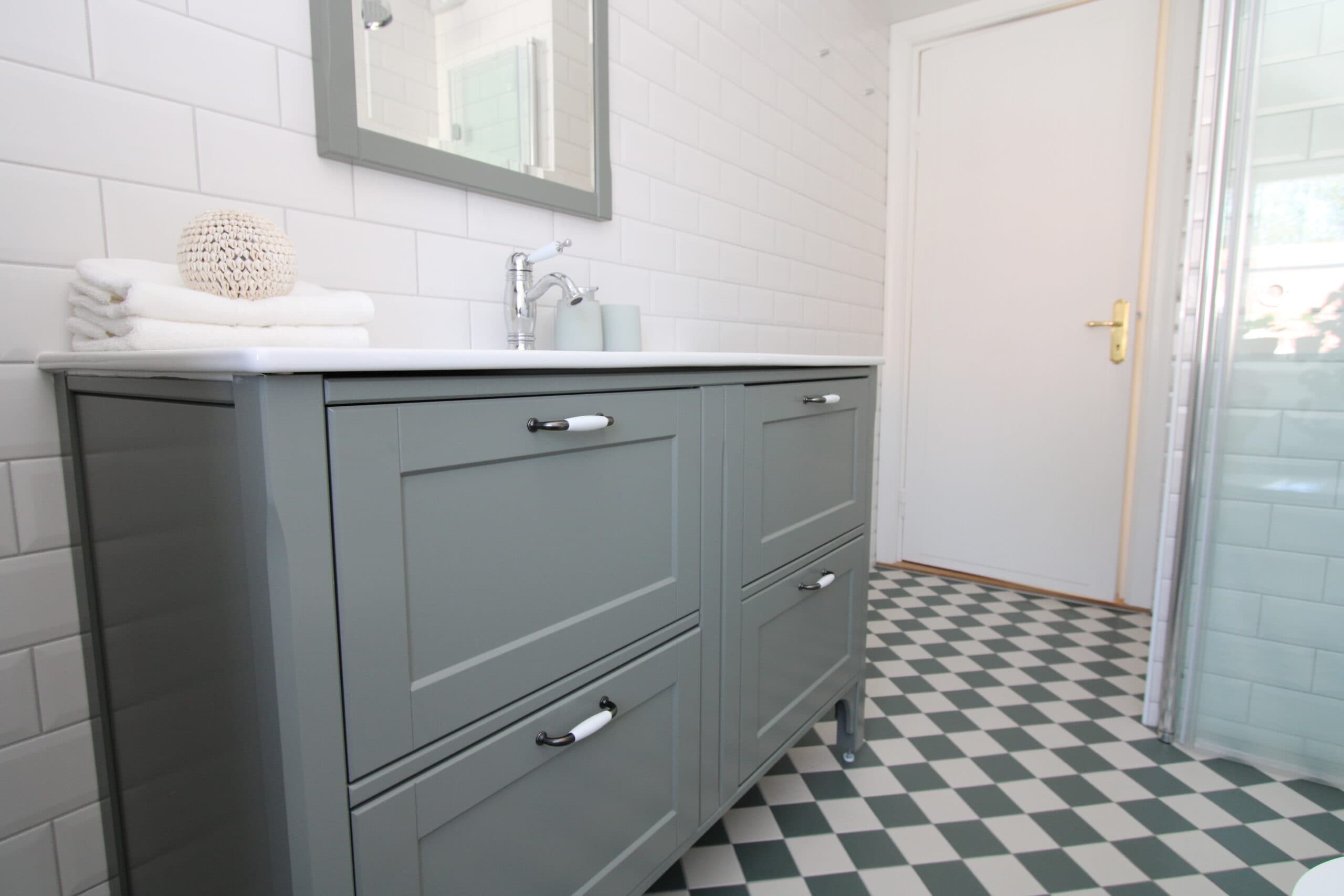 Ett stilfullt badrum med skön grund i grönt. Till golvet valdes Höganäs serie Grynna ‘Dark Green’ och ‘Dark white’ i snedlagt schackmönster, vilket gav en fin karaktär för hela rummet. Till det valdes de fint arbetade badrumsmöblerna från Björbo badrum, vilket är ett snickeri från Dalarna som funnits sedan 1916. Färgvalet på möblerna landade i mossgrönt.