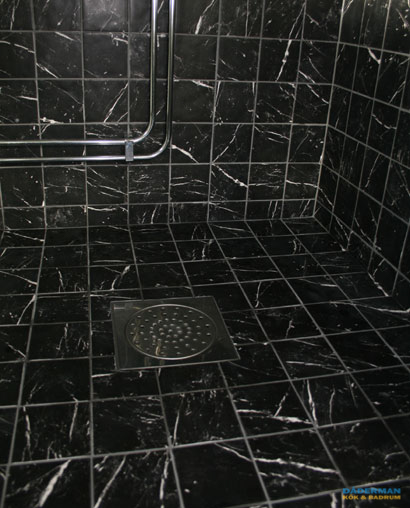 En kombination av badrum och tvättstuga. Till golvet och väggarna i duschutrymmet har kunden valt marmorliknande kakel i svart. Resten är väggarna är kaklade i vitt. Tvättmaskin och torktumlare är installerade under en arbetsbänk i svart. Duschutrymmet utgörs av svängdörrar i glas och är utrustat med både handdusch och takdusch.