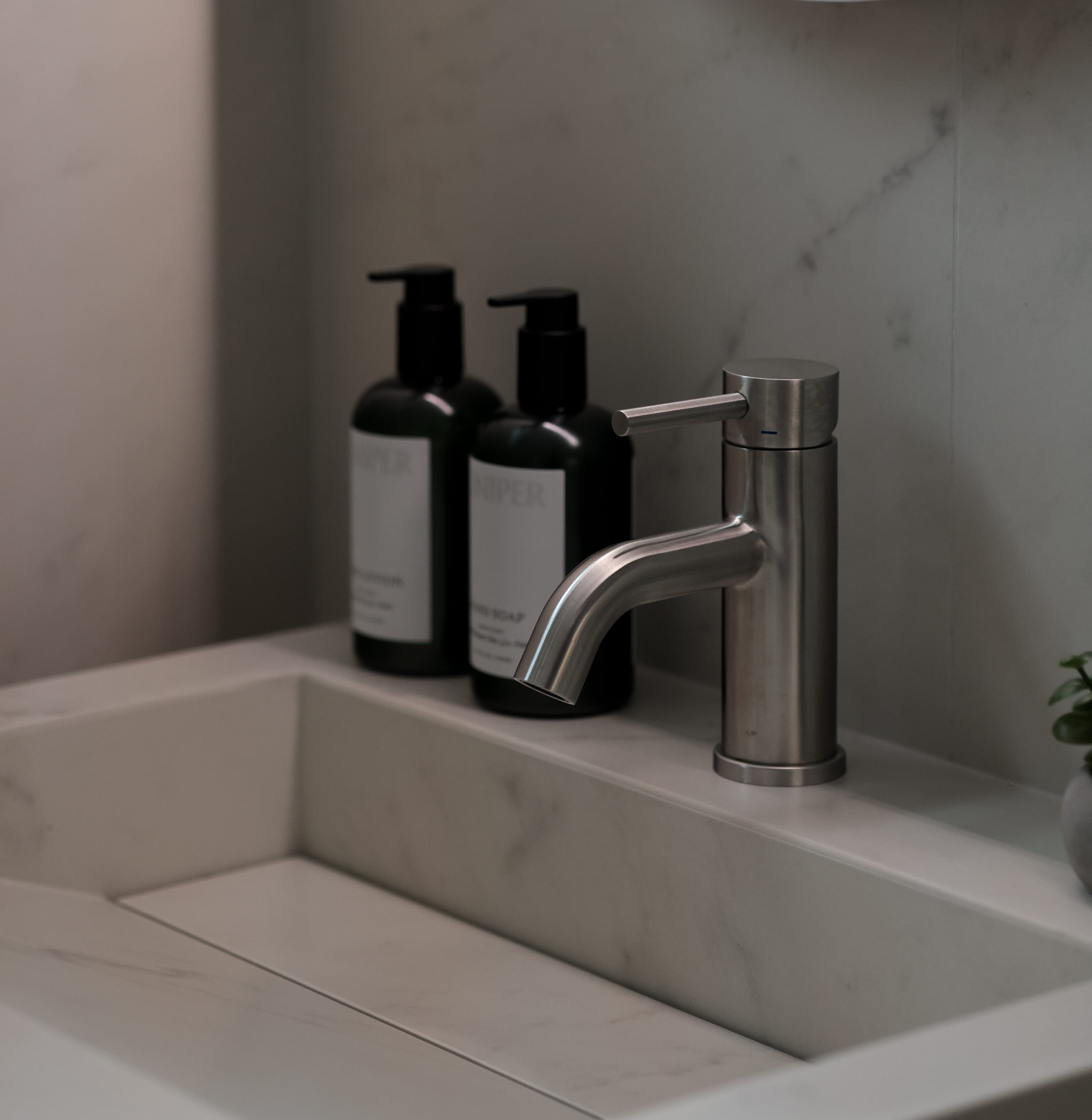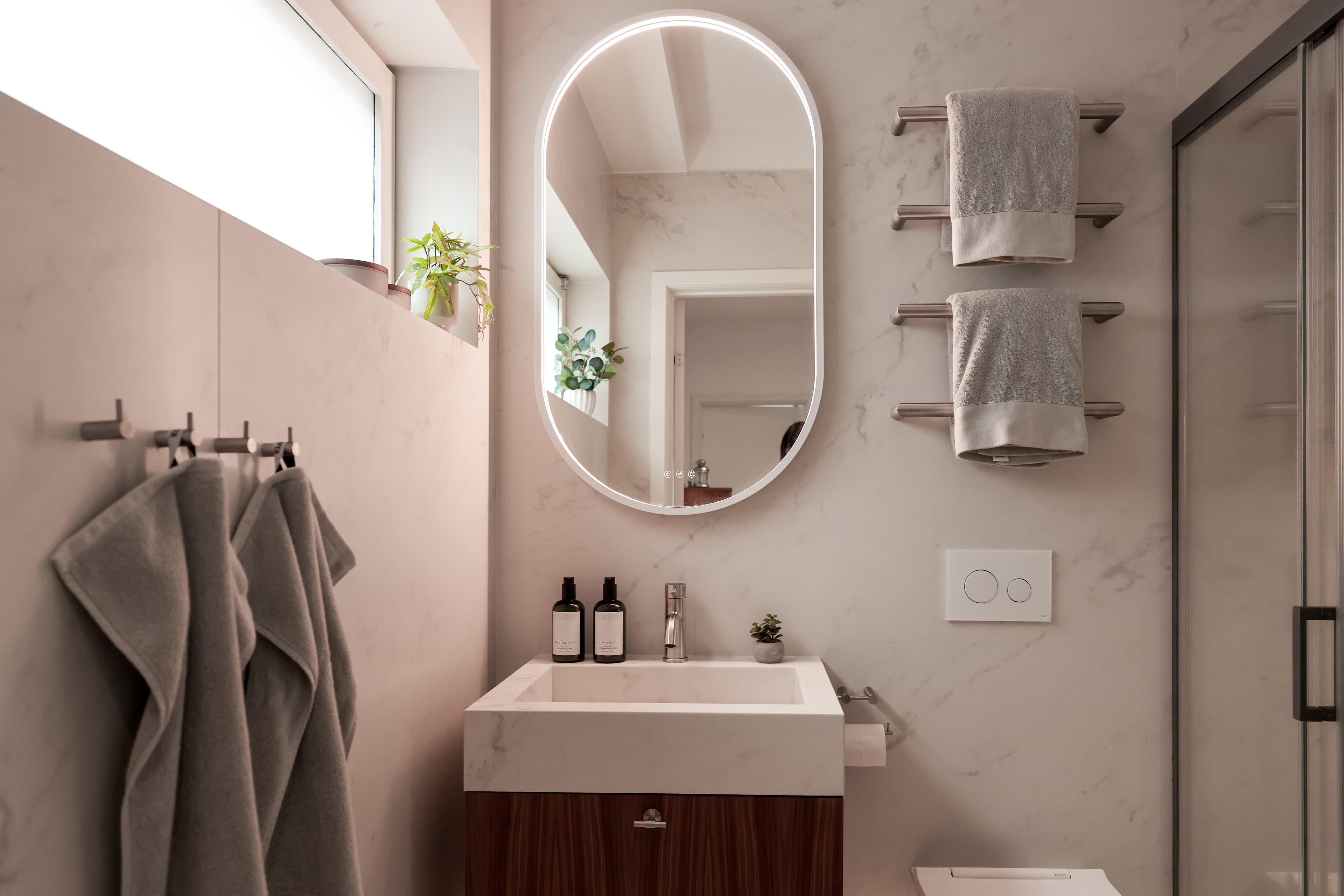 Ett badrum där kontrasten mellan ljusa stenytor och mörka trädetaljer får ta plats. Här har vi arbetat med stora kakelplattor i marmorlook tillsammans med en kommod i trä som tillför värme och skapar balans i rummet. Med dusch med glasvägg, integrerad förvaring och genomtänkt planering blir det en lösning som fungerar smidigt i vardagen och ger ett lugnt, enhetligt intryck.