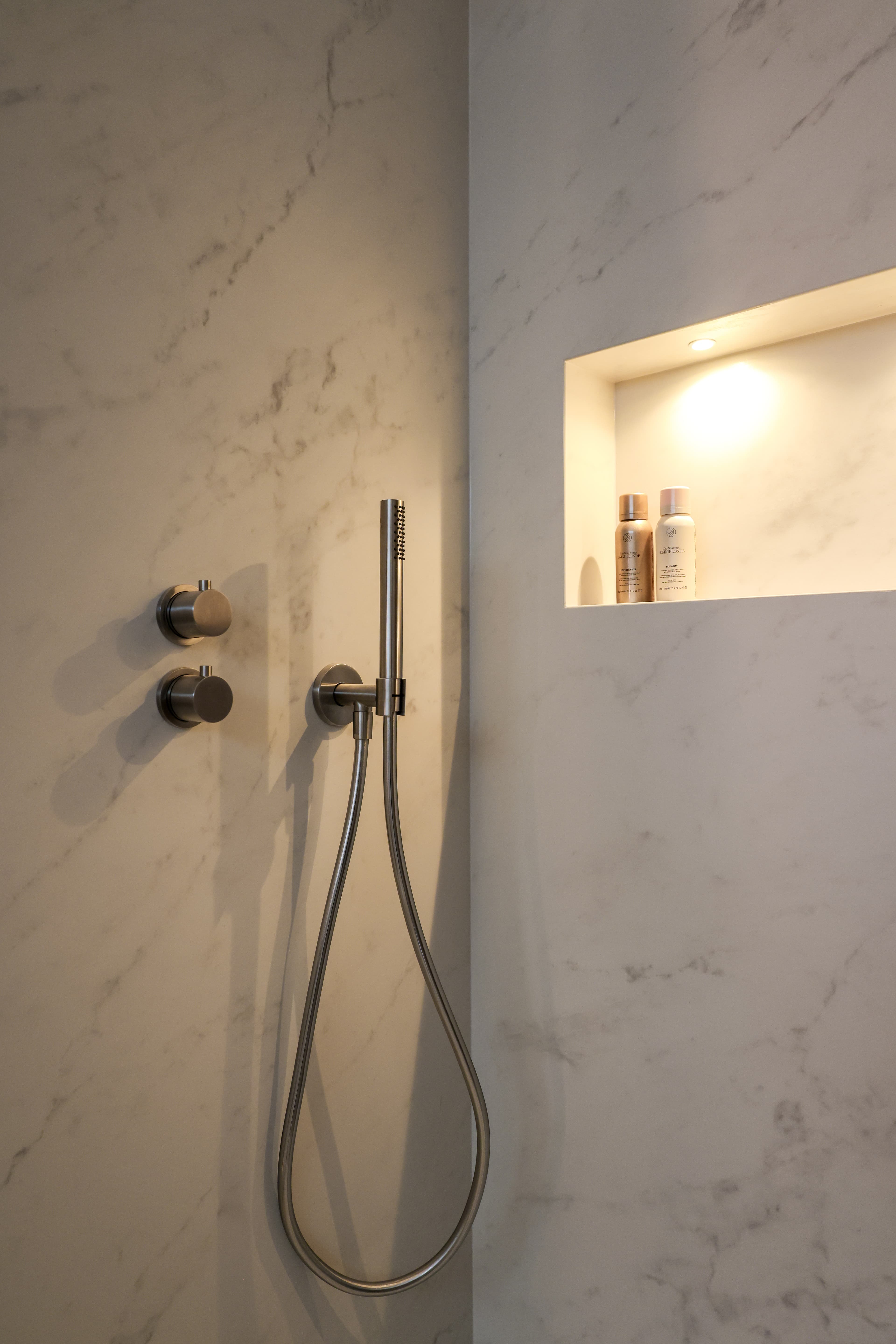 Platsbyggd dusch med infälld nisch och stilrena detaljer.