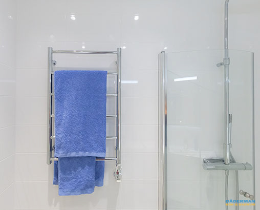 Ett litet vitt badrum med tvättmaskin. Duschutrymmet i badrummets hörn utgörs av välvda svängdörrar i glas som kan fällas ihop när duschen inte används. För att spara plats har man valt en mindre tvättmaskin och ett handfat med mindre djup.