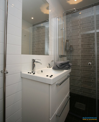 Badrummets vita väggar bryts av med liggande stenstavar i duschutrymmet. Duschen är utrustad med både handdusch och takdusch och skiljs av från resten av badrummet med dubbeldörrar i glas. Intill duschen finns en tvättmaskin installerad under en bänkskiva i massivt trä. Badrummet är utrustat med en modern handfatsmöbel och dubbla handdukstorkar.