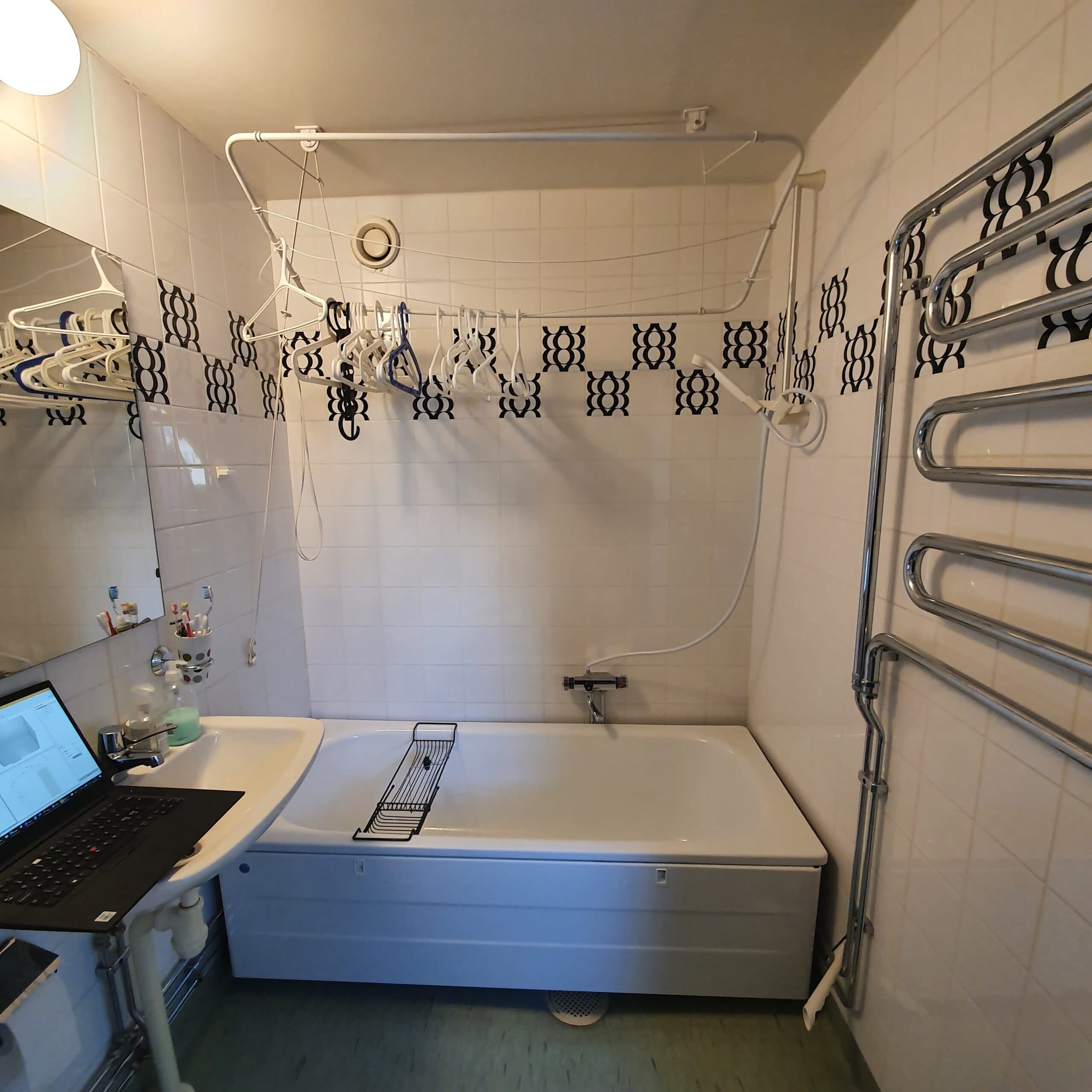 Istället för ett badkar som tidigare valdes nu att sätta in duschväggar från Svedbergs som lätt kan skjutas åt sidan för att ge plats och torkställning.