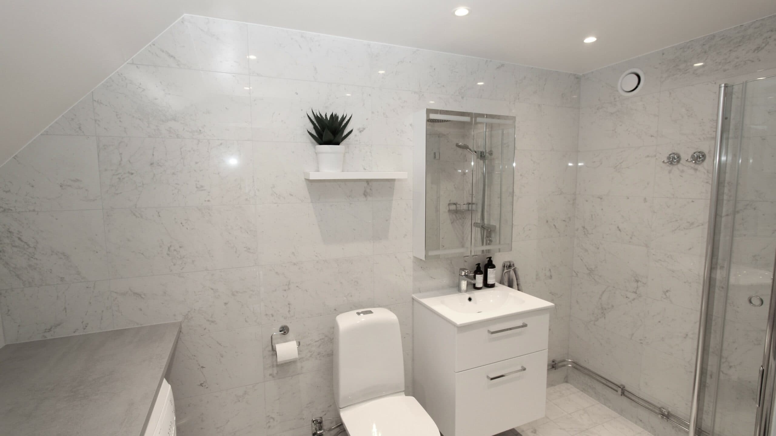 Vår kund önskade ett ljust badrum då det inte finns något ljusinsläpp men istället för att sätta vitt på väggarna valdes granitkeramikplattan Marmi Carrera, vilket är en reproduktion av den Italienska naturstenen Carrera. Men en naturtrogen ådring skapas en härlig känsla av lyx och rummet blir stilrent och harmoniskt. Klassisk marmor tilltalar fler generationer och håller över tid.