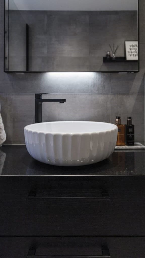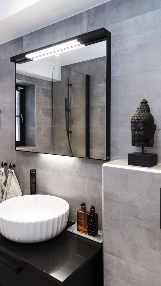 Stig in i ett badrum där exklusiva detaljer möter moderna ytskikt. Ljusinsläppet från fönstret är centralt i rummet och tillsammans med de svarta och grå tonerna skapas en sober men lyxig hotellkänsla.