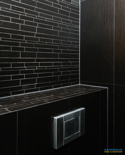 Ett modernt badrum helt i svart. På väggarna kombineras större svarta kakelplattor med mindre svart mosaik. Duschutrymmet är utrustat med både hand- och takdusch. Ett rundat handfat är placerat på en underdel med lackad, svart yta intill en toalett som även den är vägghängd. Extra förvaringsutrymme finns i de högblanka väggskåp som monterats mittemot toalett och handfat. Badrummet har spotlights i taket och inbyggd belysning i badrumsspegeln.