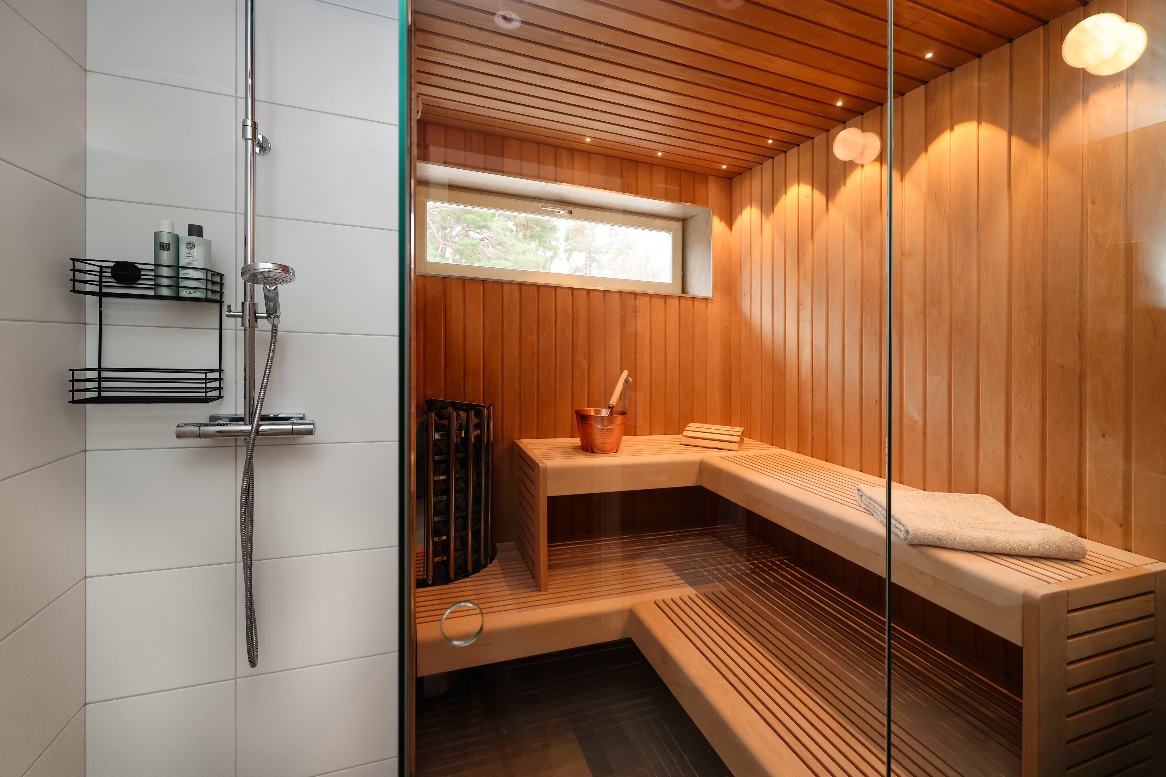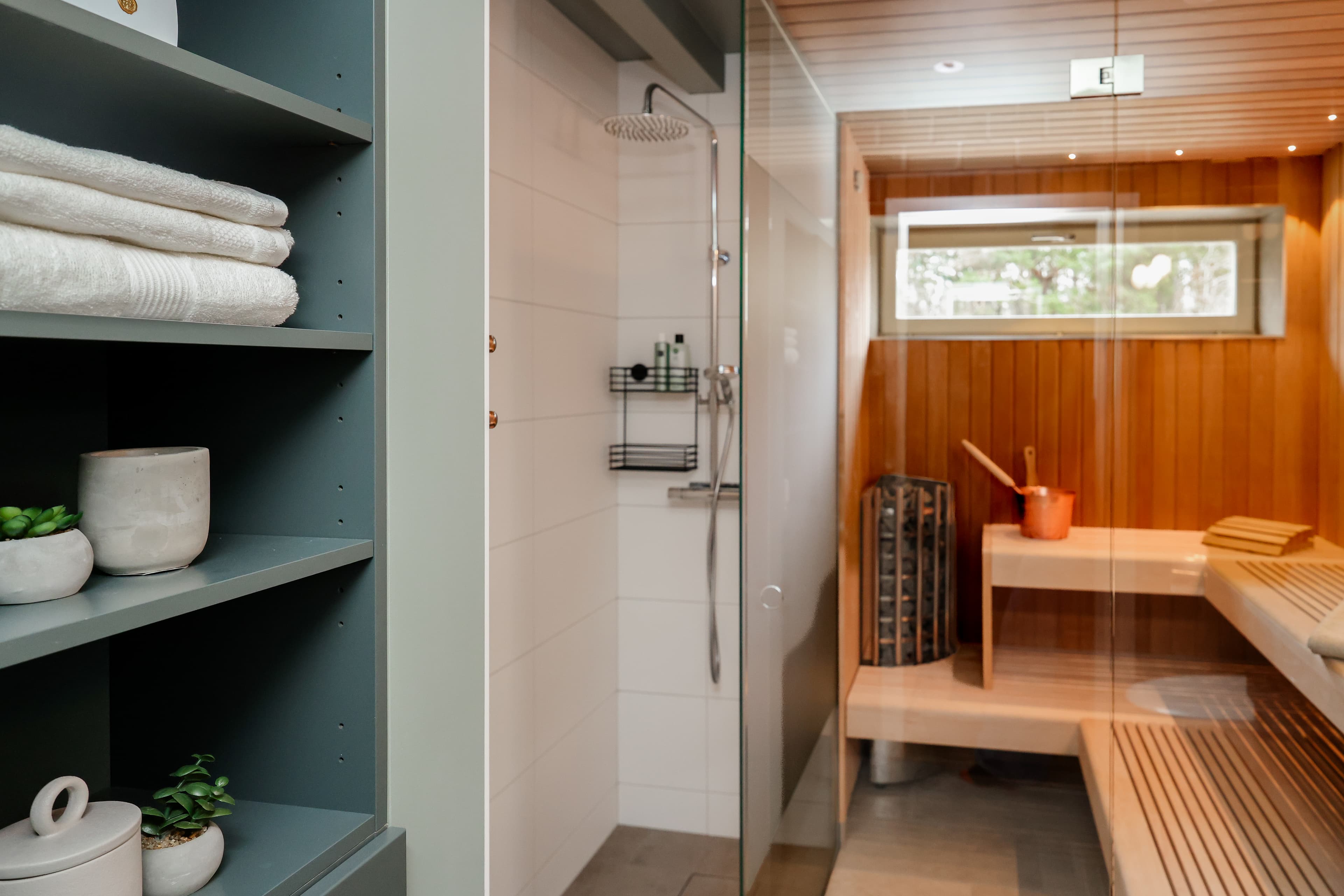 Duschdel i anslutning till bastun med glasvägg.