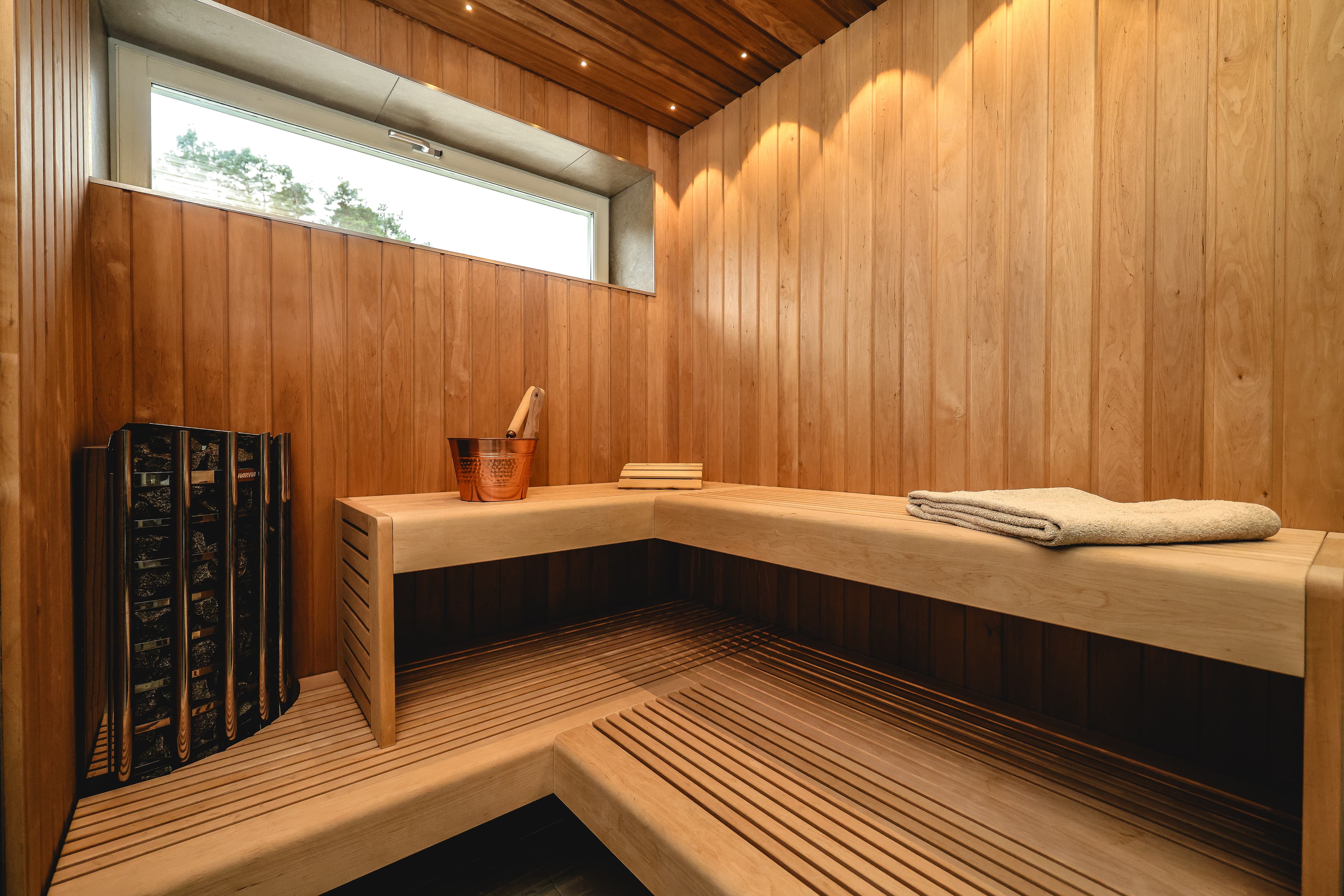 Bastun är byggd med rymliga sittbänkar och smart placering av aggregatet för både komfort och säkerhet. Den stora glasytan öppnar upp rummet och släpper in ljus, vilket gör att helheten känns luftig.