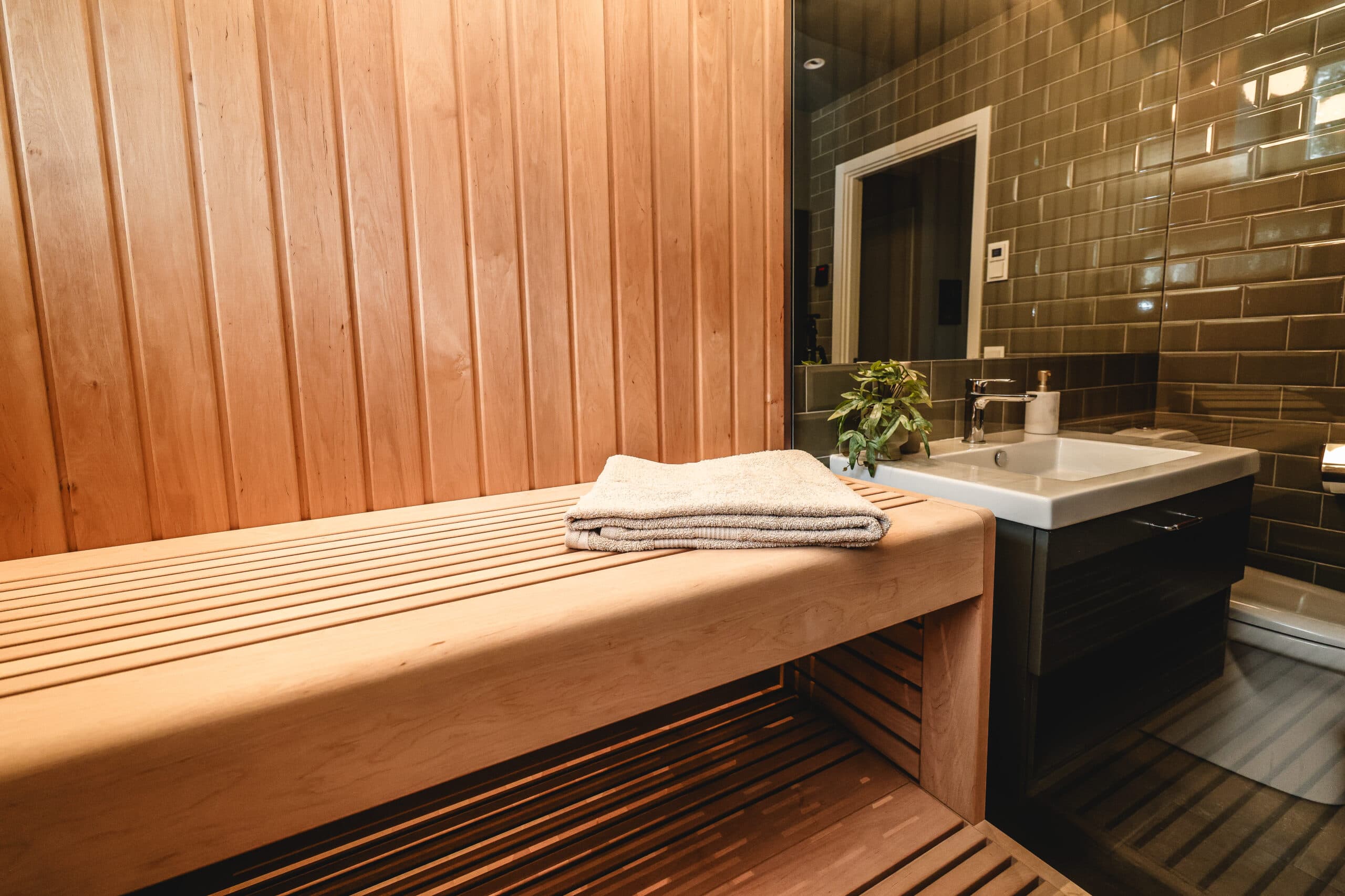 Här har vi integrerat en bastu i badrummet för att skapa en tydlig spa-känsla i hemmet. Träpanelen tillsammans med den dämpade belysningen ger ett varmt och inbjudande intryck.