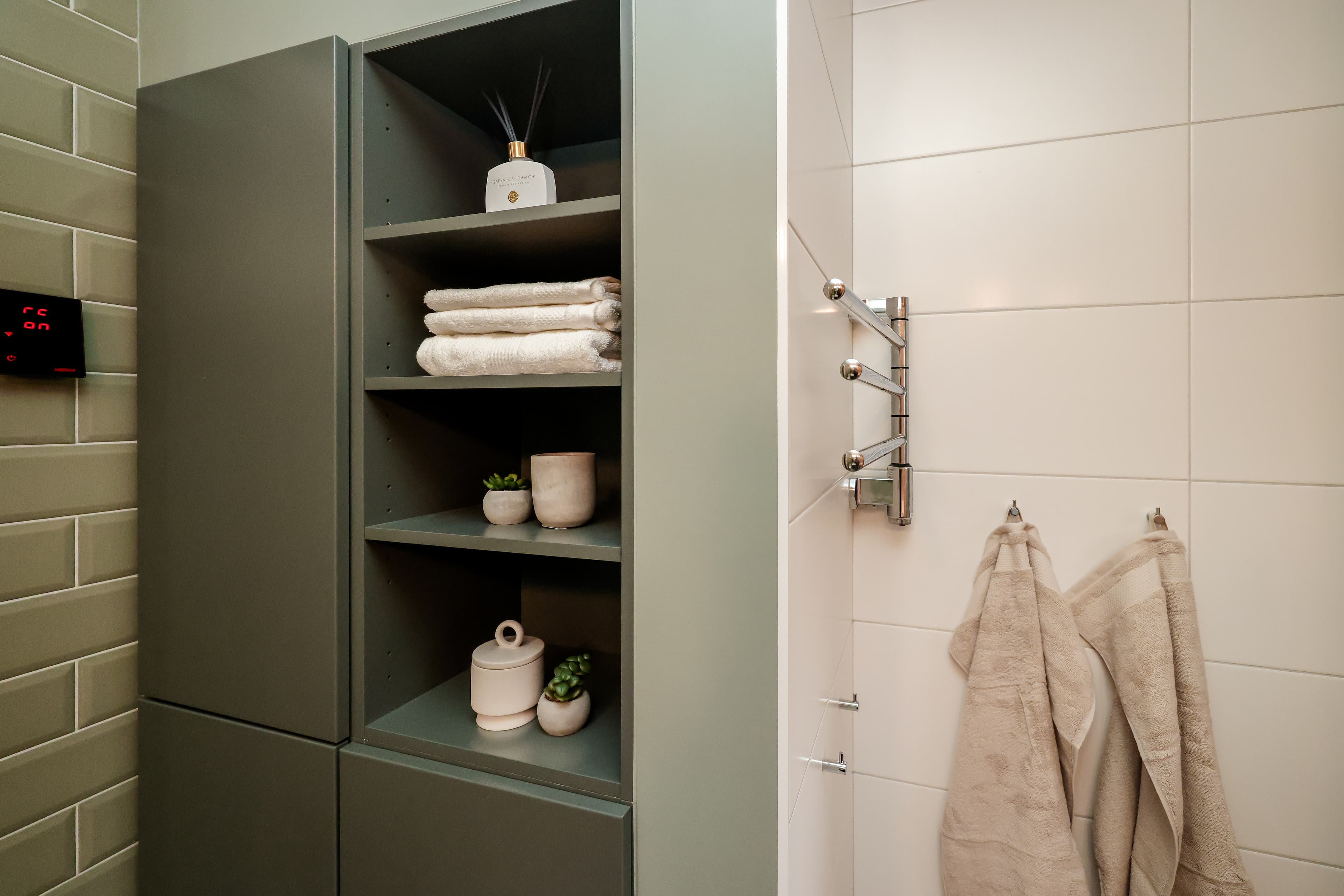 Praktisk förvaring med öppna hyllor och handdukstork.