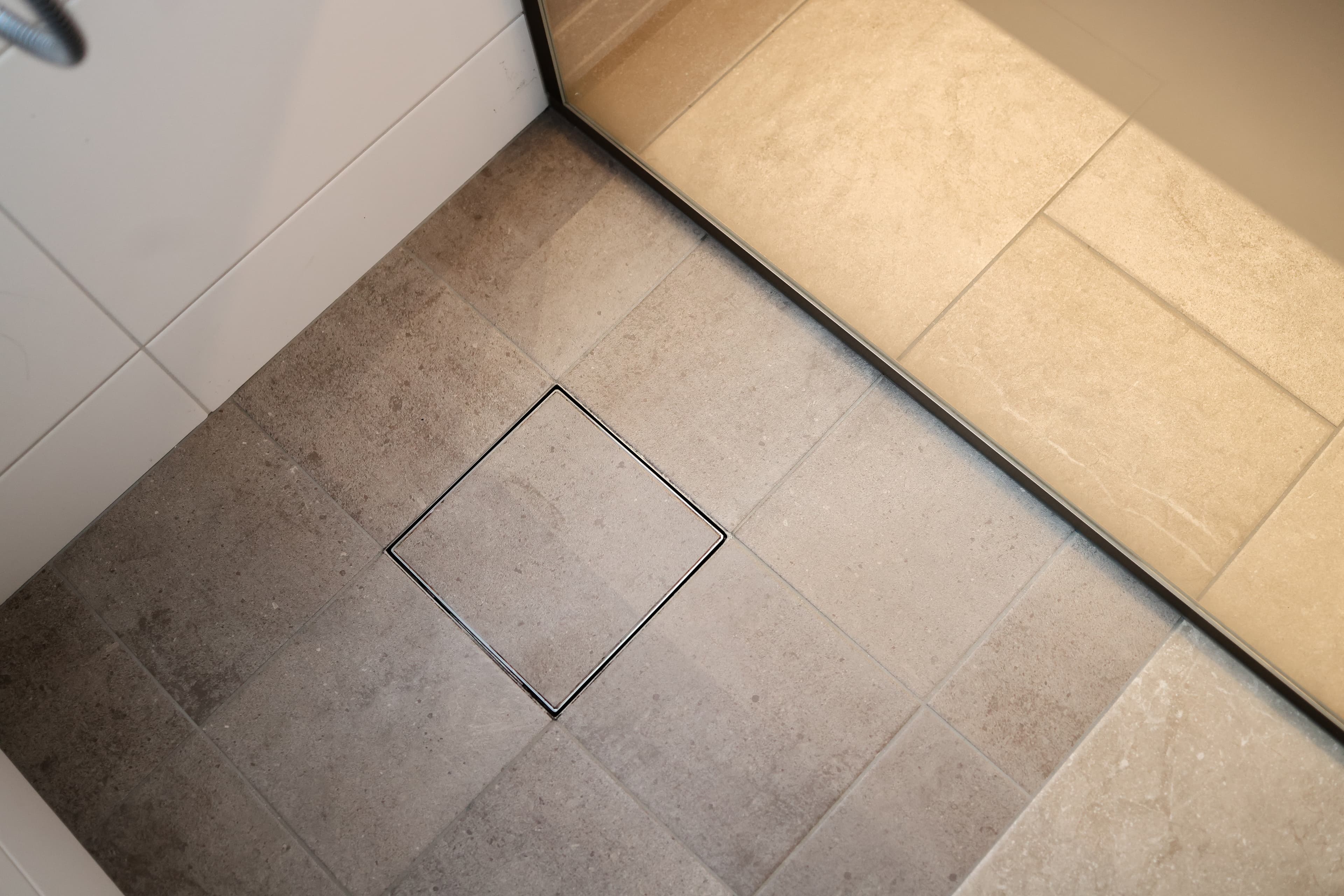 Klinkergolv med integrerad och diskret golvbrunn.