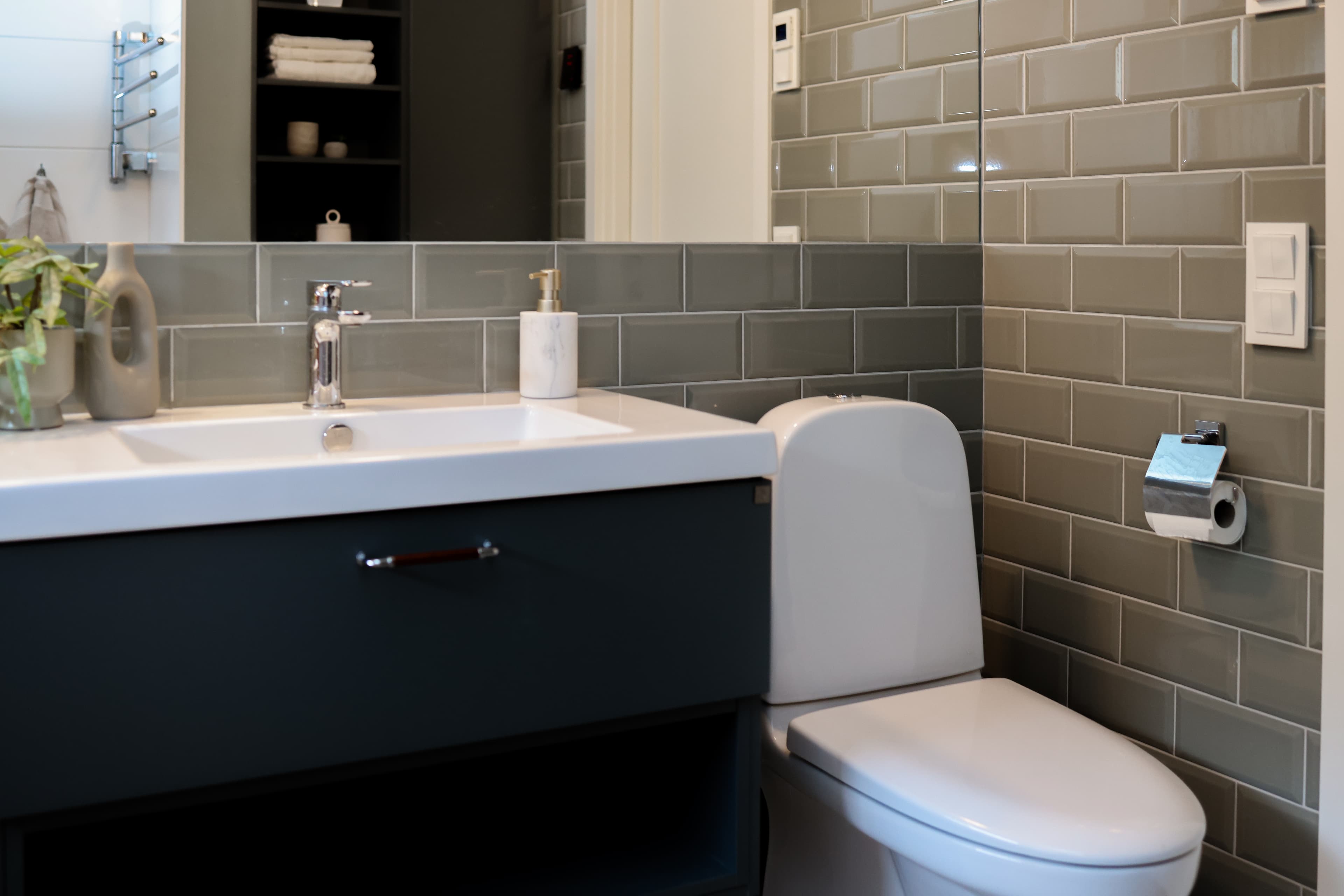 Kompakt badrumsdel med stilrena kakelplattor.