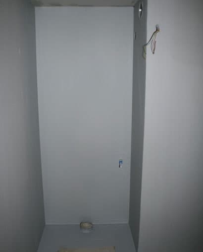 Montering av nya skivor på väggar och tak. På väggarna monteras ”Norgips Humidboard”. Enligt nya regler får gamla gipsskivor med papper på inte användas i våtzon 1. Vi monterar därför våtrumskivor i hela badrummet. Taket spacklas.